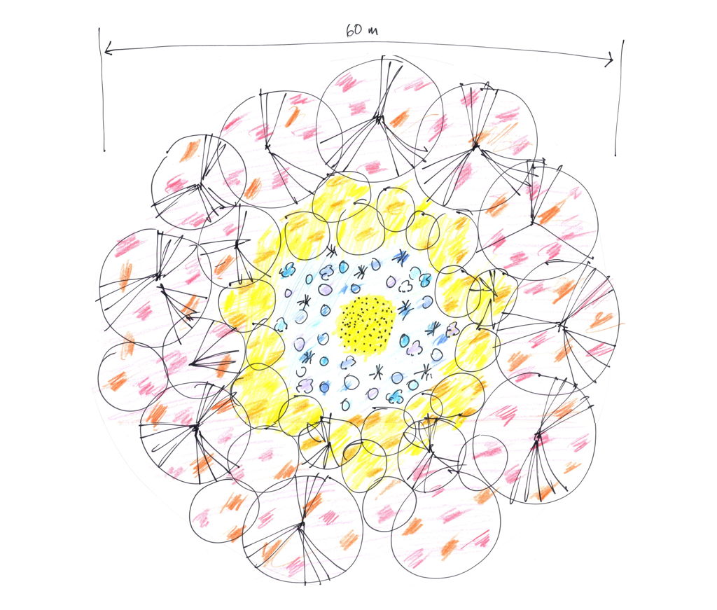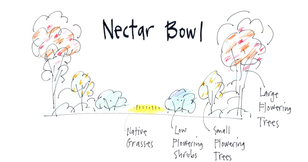 Nectar Grove will be a large scale land-art installation produced on a bushland property west of the Blue Mountains in NSW that was devastated by the recent bushfires. We will plant a 60m diameter circular grove that attracts native birds and bees. The concentric circles will be planted with tall native trees on the outside edge and progressively smaller shrubs and bushes, creating a bowl of nectar that will nurture bees and honey eaters. Each circle will contain plants producing different flowers creating bands of changing colour. Viewers will enter the garden to spend peaceful, contemplative time in the circular space at the centre of the artwork planted with native grasses.